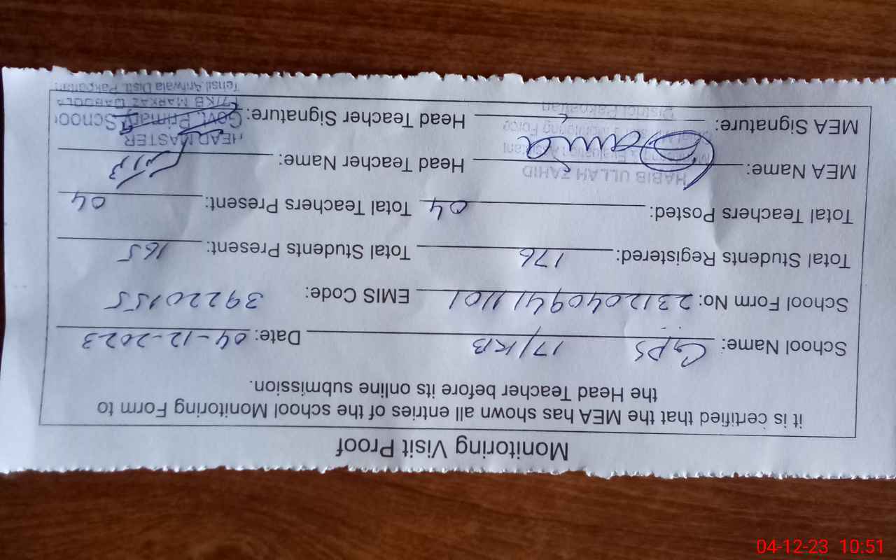 | Attendance Register | Head Teacher | MEA with School | Visit Proof |