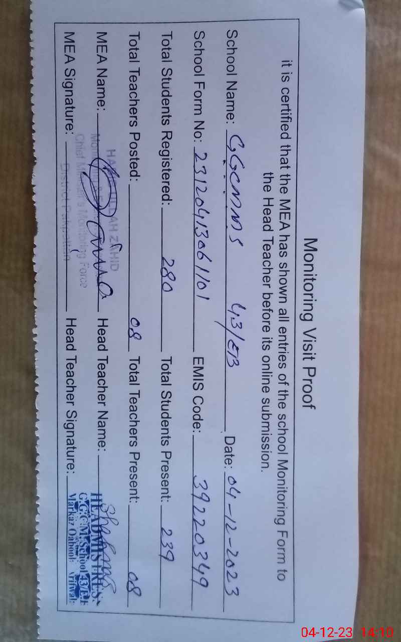 | EMIS Code: 39220349 | Name of School: GGCMES 43 EB P/O KOT KHUDA BUKHSH | |||