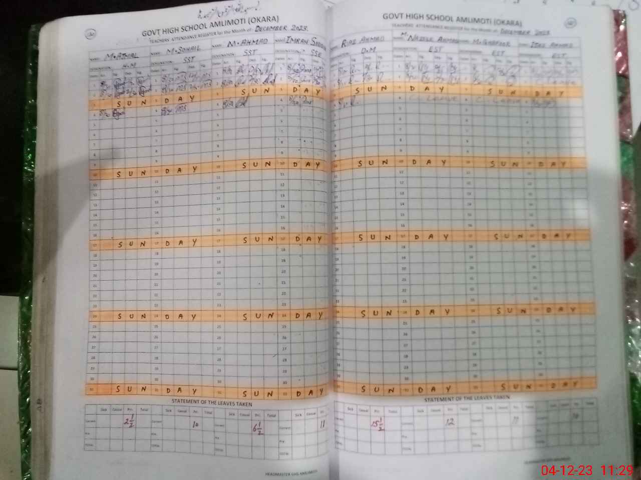 | CNIC | Full Name | Designation | R/C | Absence During Last Calender Month |