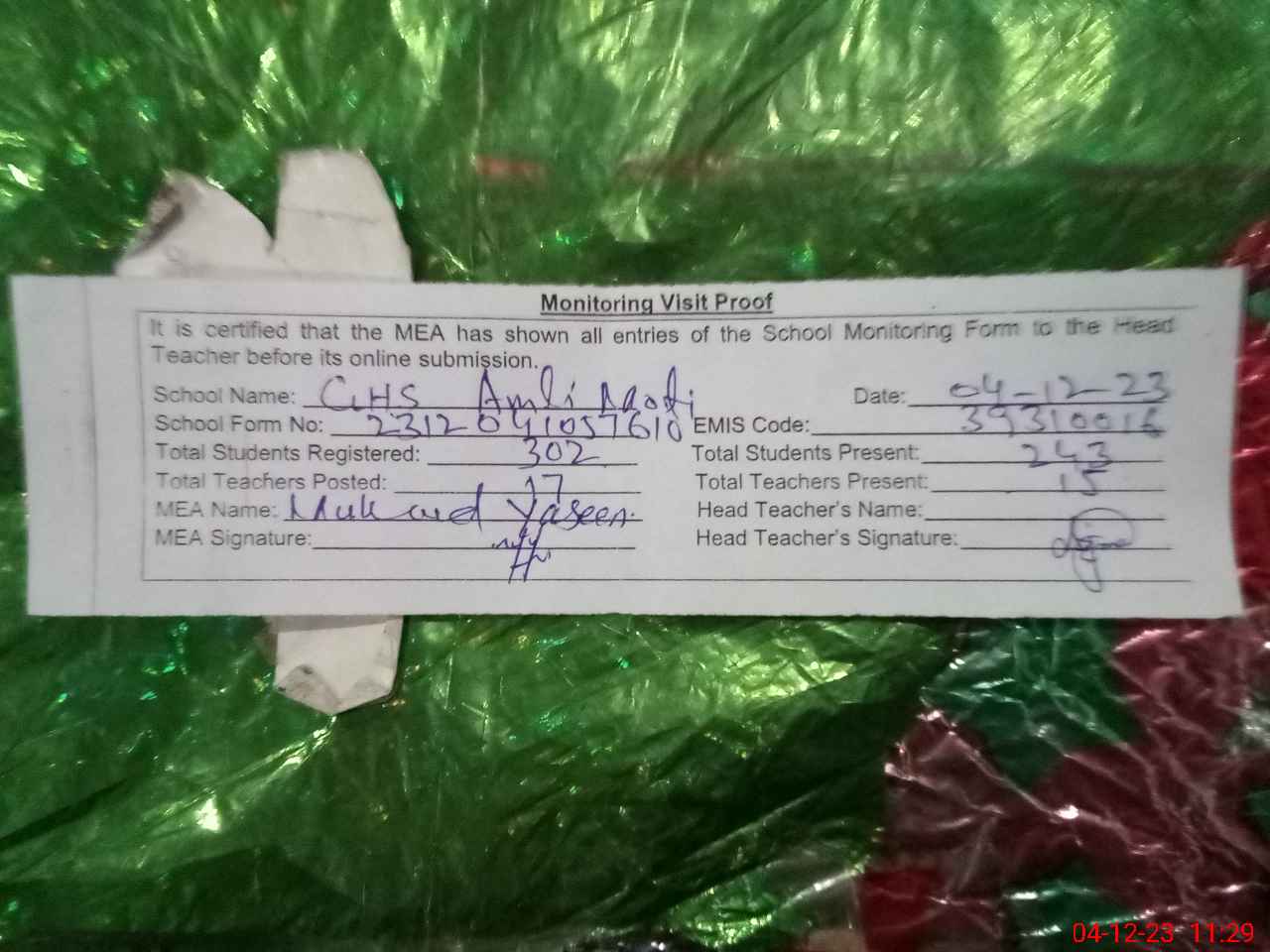 | Attendance Register | Head Teacher | MEA with School | Visit Proof |