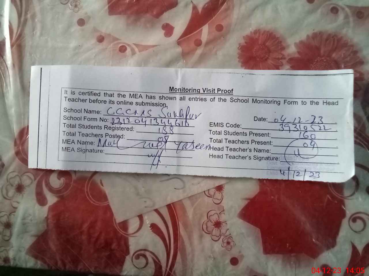| Attendance Register | Head Teacher | MEA with School | Visit Proof |