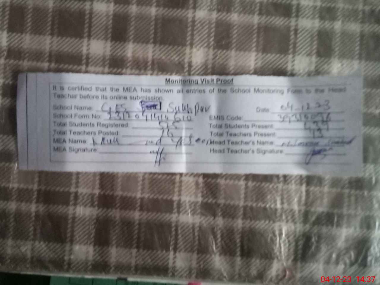 | Attendance Register | Head Teacher | MEA with School | Visit Proof |
