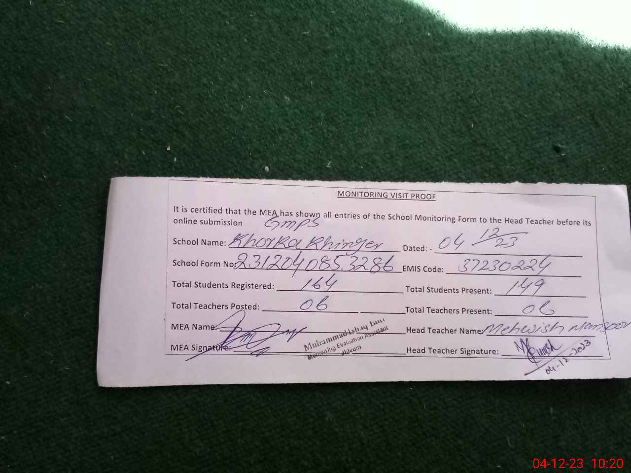 | Attendance Register | Head Teacher | MEA with School | Visit Proof |