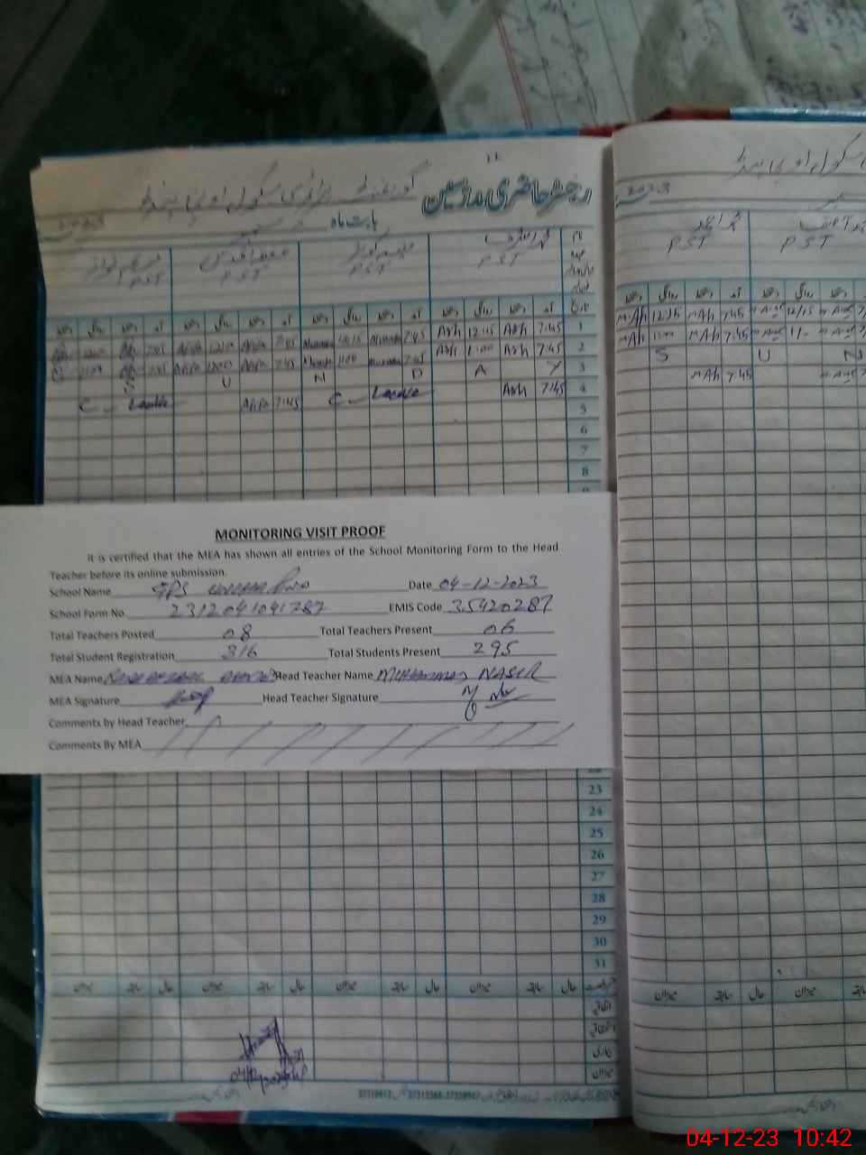 | Attendance Register | Head Teacher | MEA with School | Visit Proof |