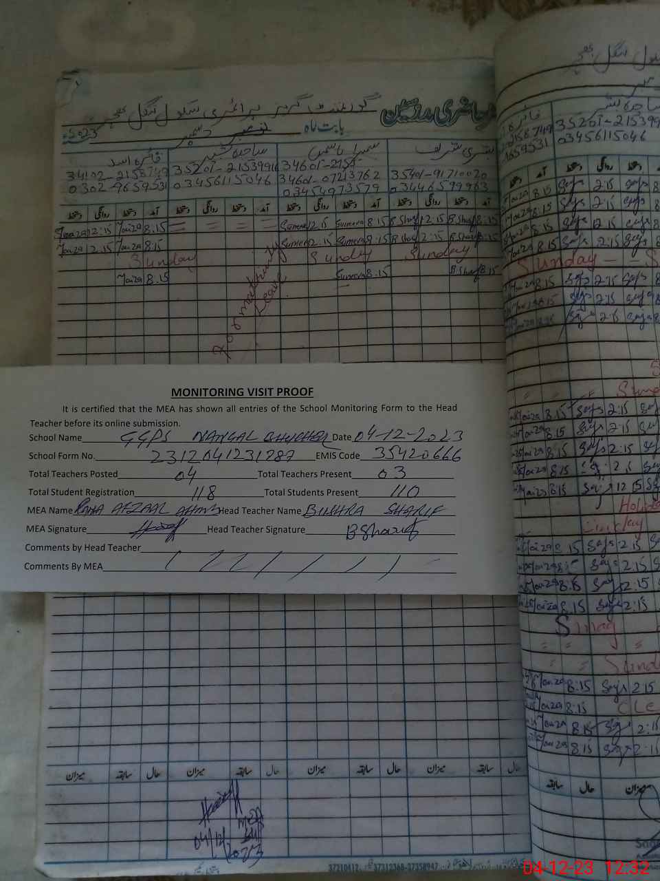 | Attendance Register | Head Teacher | MEA with School | Visit Proof |