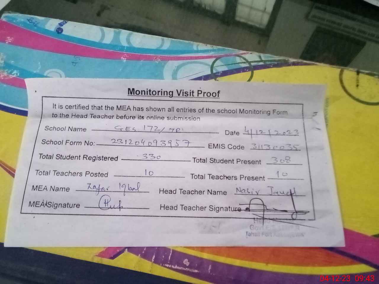 | Attendance Register | Head Teacher | MEA with School | Visit Proof |