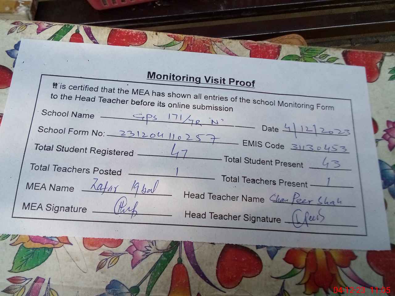 | Attendance Register | Head Teacher | MEA with School | Visit Proof |