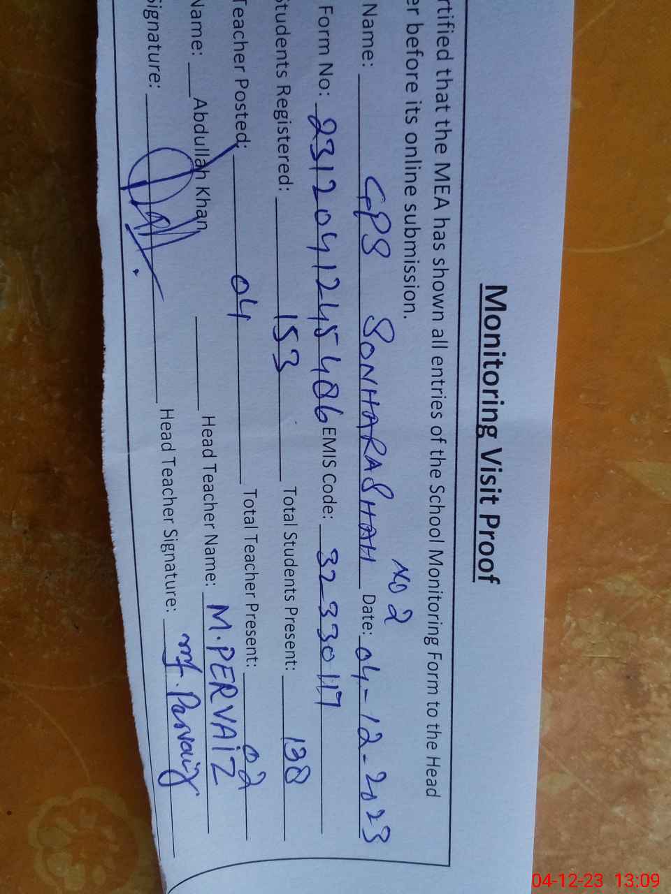 | Attendance Register | Head Teacher | MEA with School | Visit Proof |