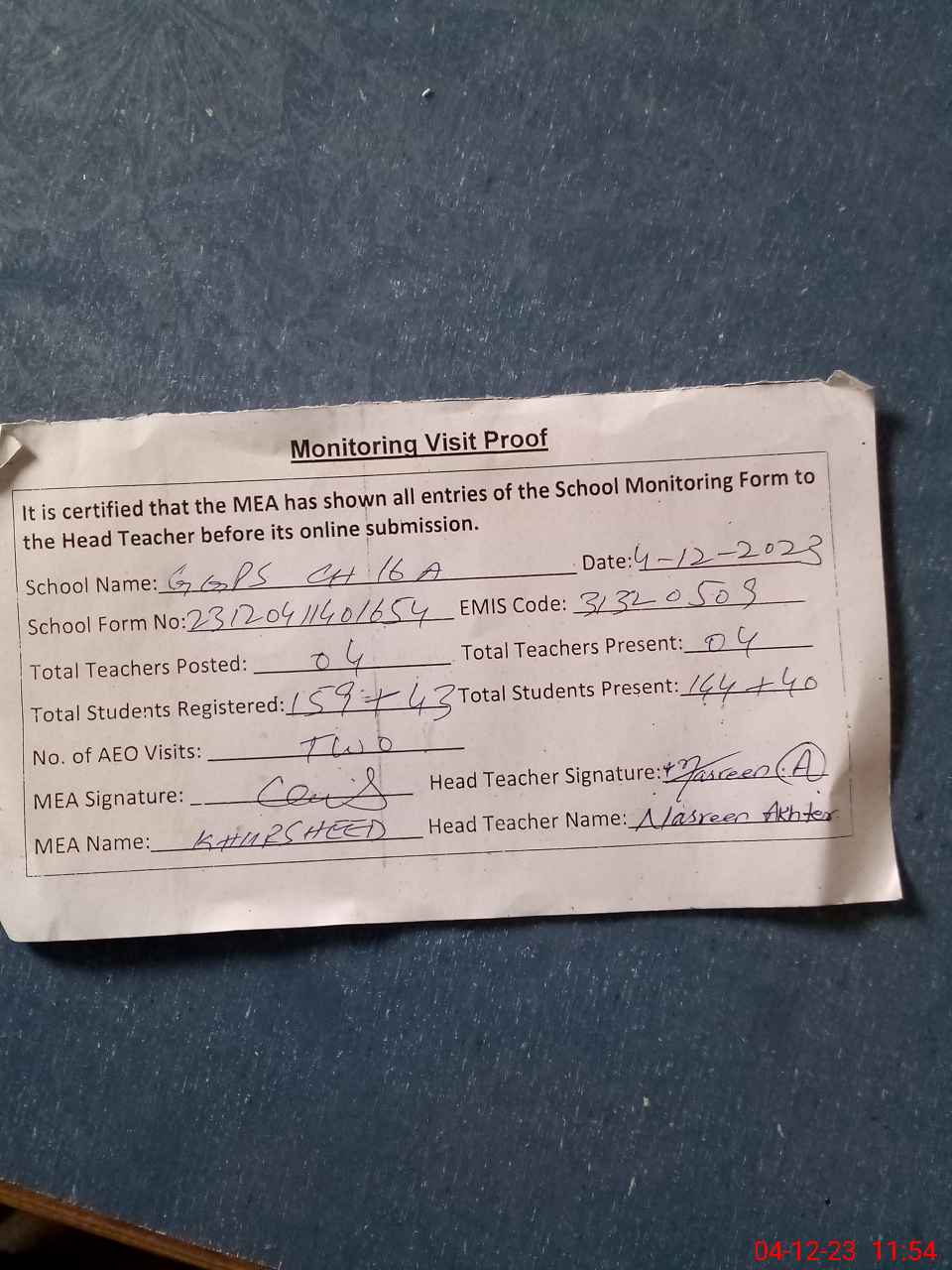 | EMIS Code: 31320509 | Name of School: GGPS CHAK NO.16/A | |||