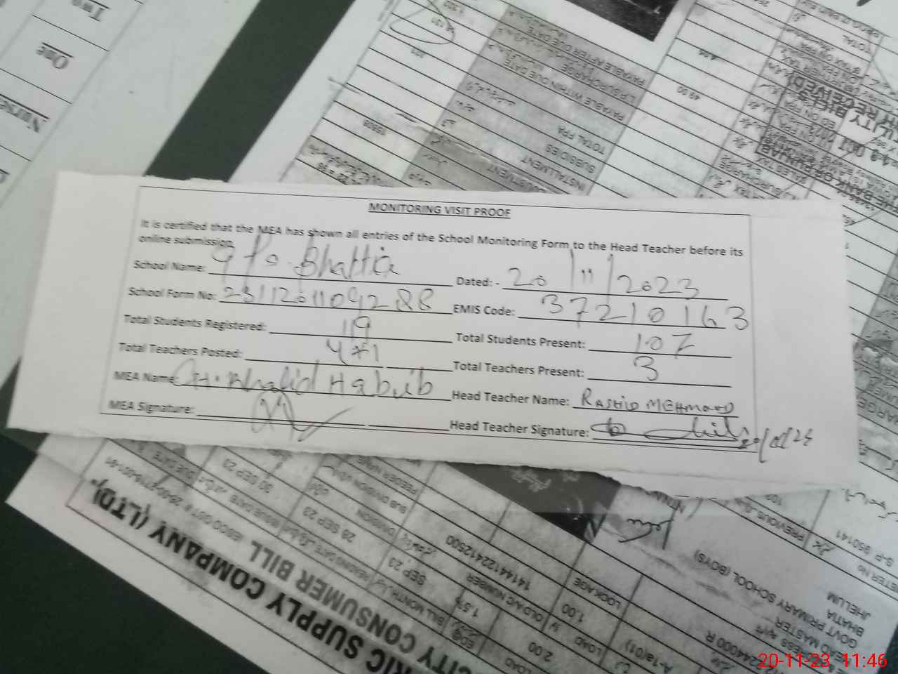 | Attendance Register | Head Teacher | MEA with School | Visit Proof |