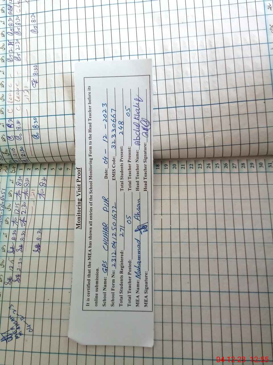 | Attendance Register | Head Teacher | MEA with School | Visit Proof |