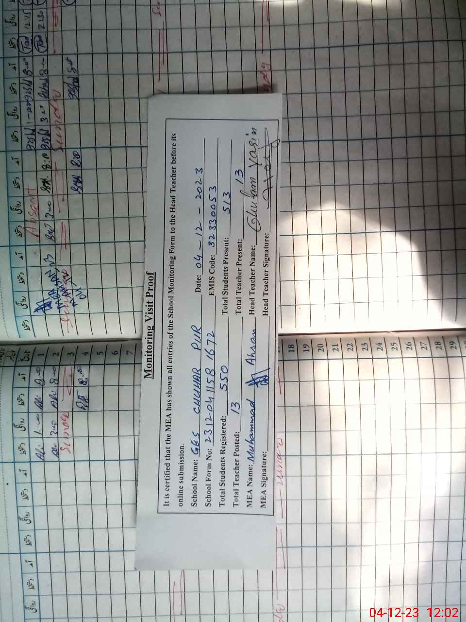 | Attendance Register | Head Teacher | MEA with School | Visit Proof |