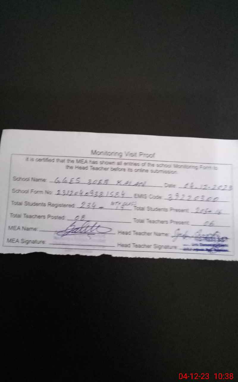 | Attendance Register | Head Teacher | MEA with School | Visit Proof |
