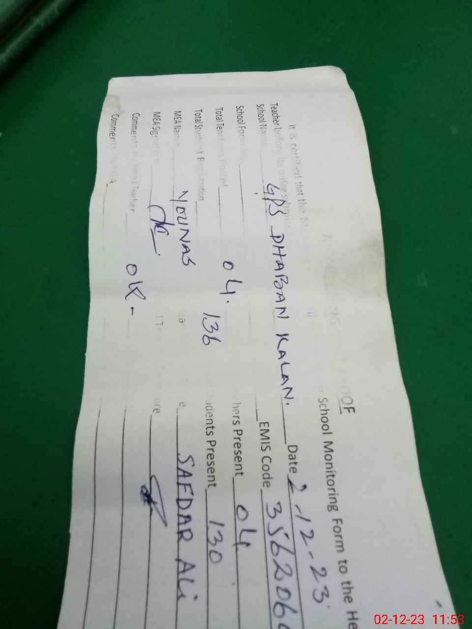 | Attendance Register | Head Teacher | MEA with School | Visit Proof |