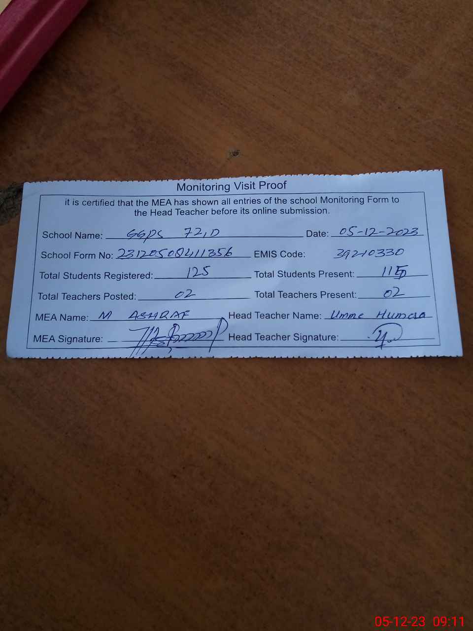 | Attendance Register | Head Teacher | MEA with School | Visit Proof |