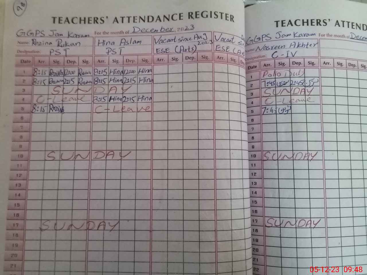 | CNIC | Full Name | Designation | R/C | Absence During Last Calender Month |