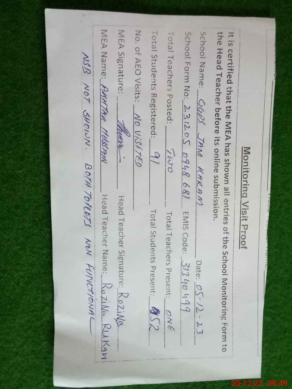 | Attendance Register | Head Teacher | MEA with School | Visit Proof |