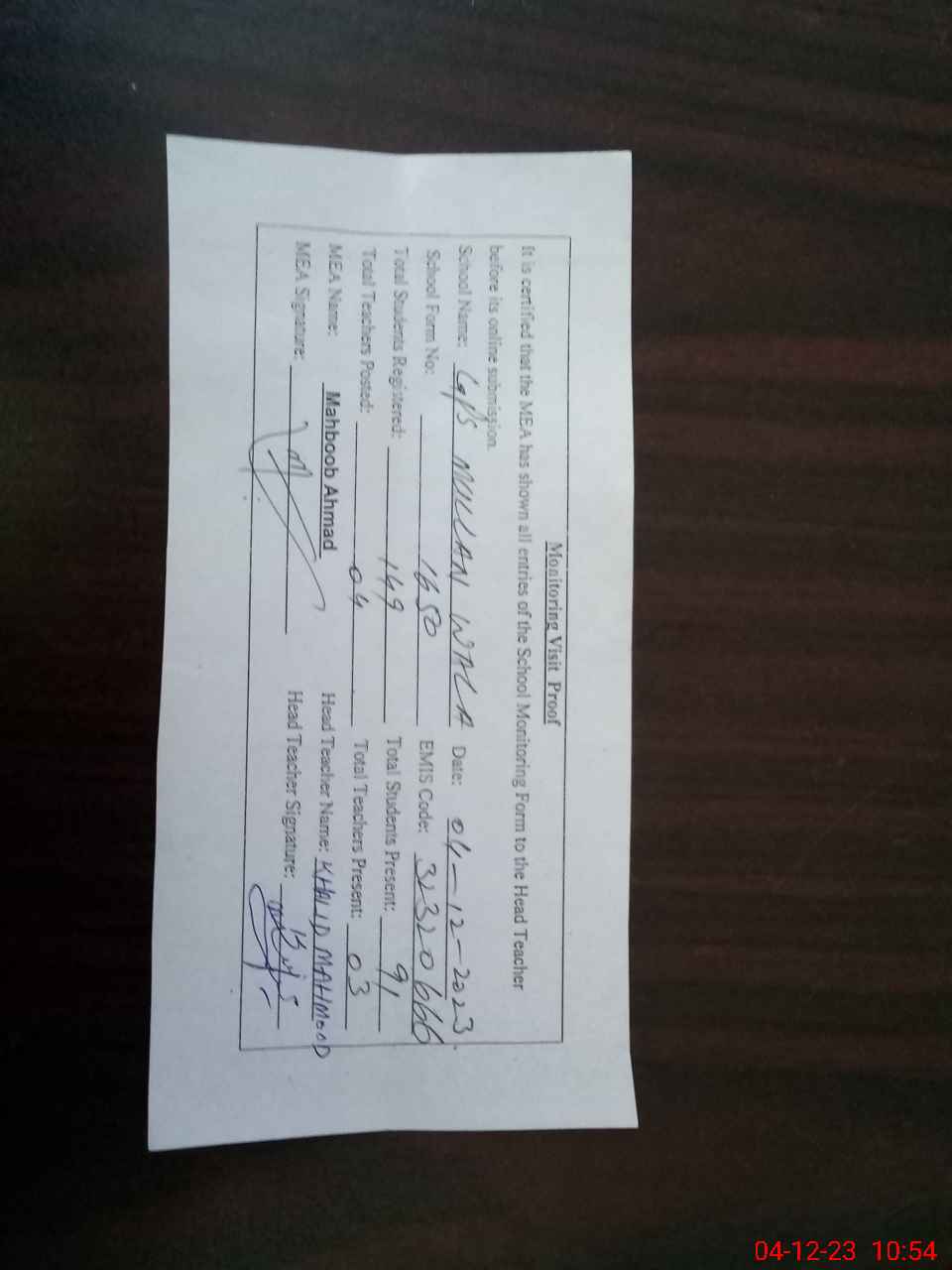 | EMIS Code: 32320666 | Name of School: GPS MULLAN WALA | |||