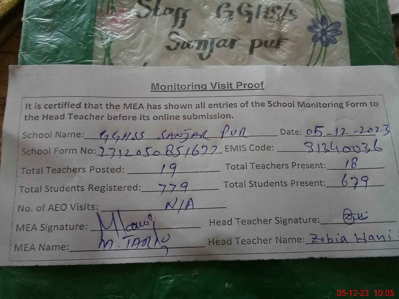 | Attendance Register | Head Teacher | MEA with School | Visit Proof |