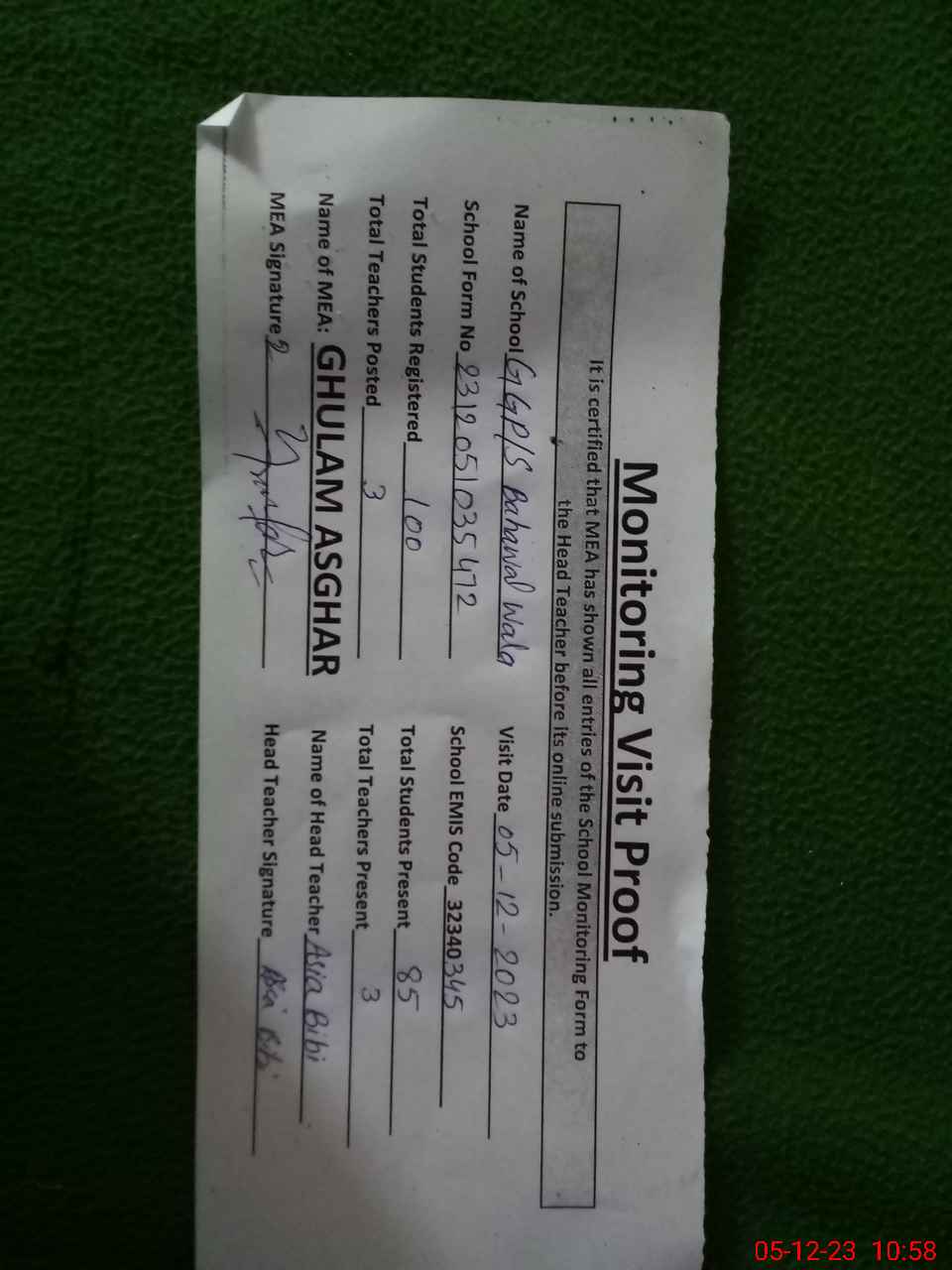 | EMIS Code: 32340345 | Name of School: GGPS BAHAWAL WALA | |||