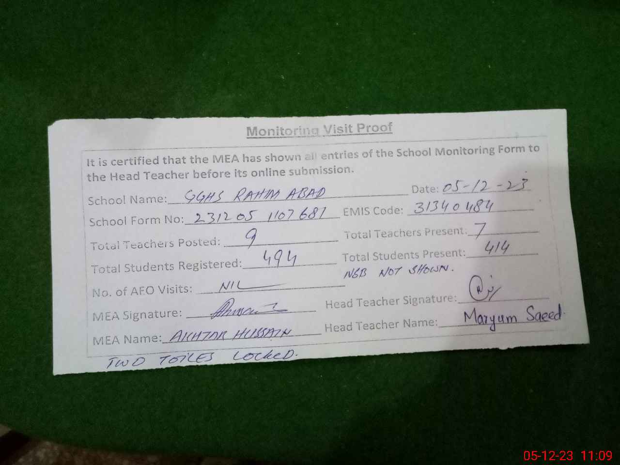 | Attendance Register | Head Teacher | MEA with School | Visit Proof |