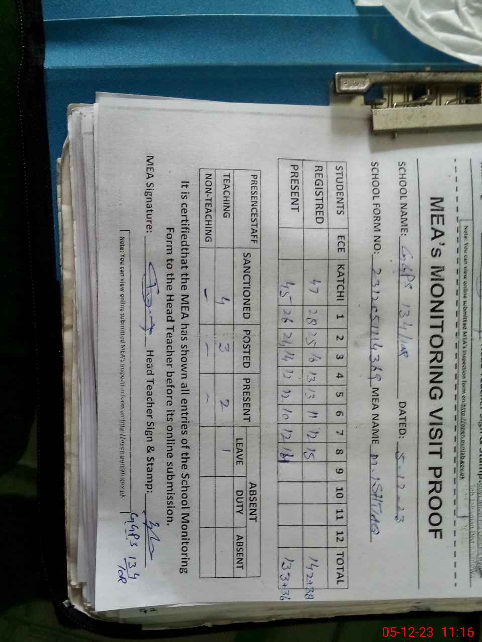 | Attendance Register | Head Teacher | MEA with School | Visit Proof |