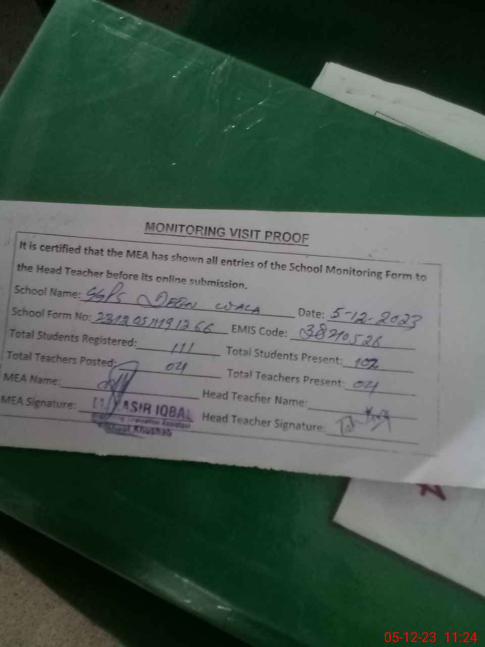 | EMIS Code: 38210526 | Name of School: GGPS DEEN WALA | |||