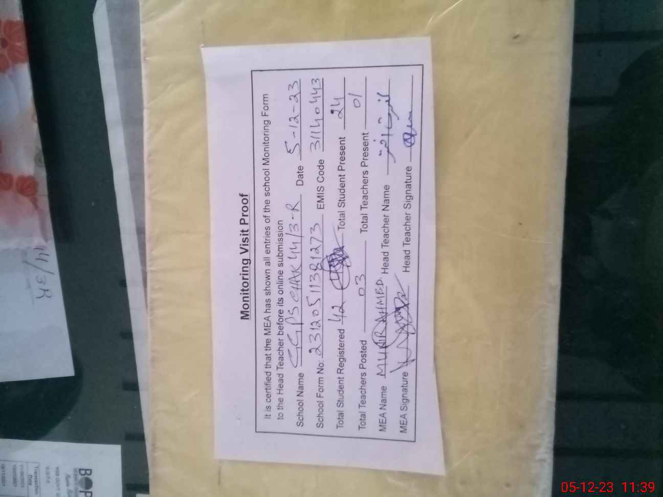 | Attendance Register | Head Teacher | MEA with School | Visit Proof |