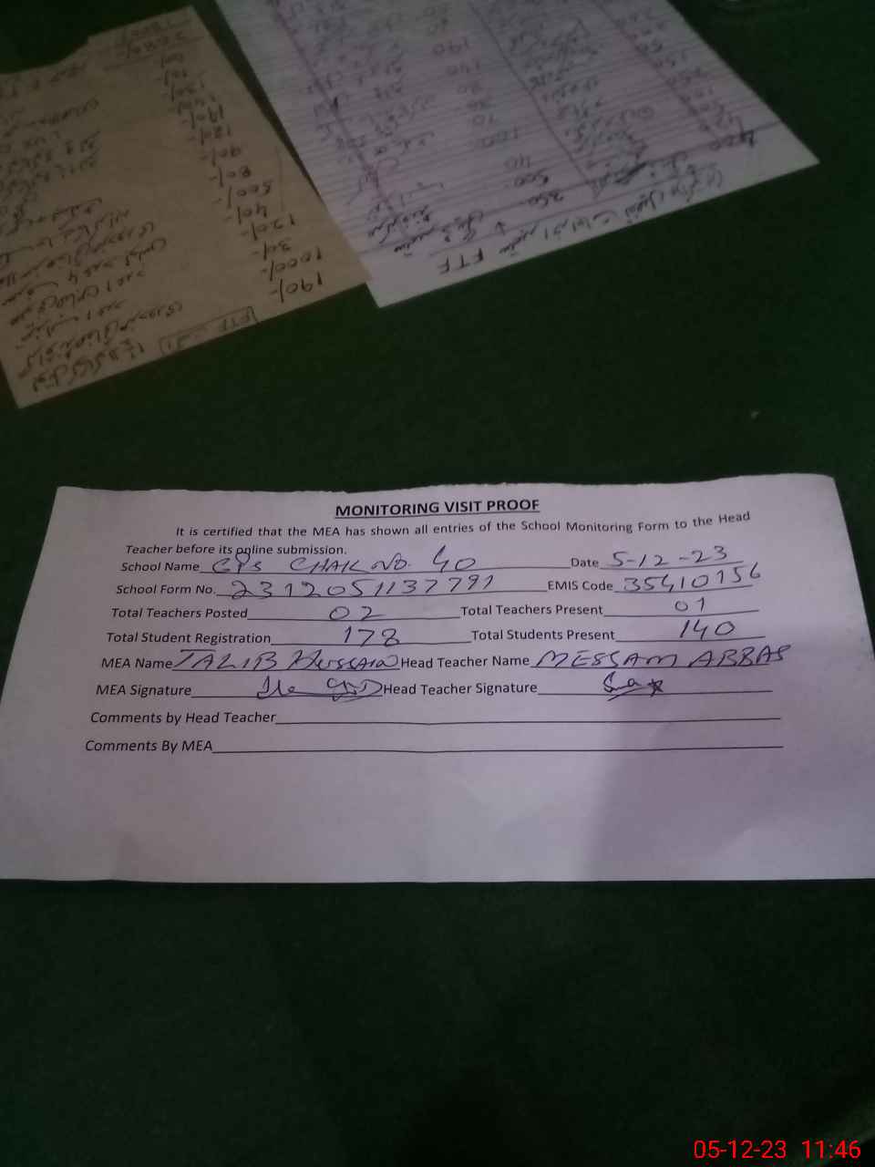 | Attendance Register | Head Teacher | MEA with School | Visit Proof |