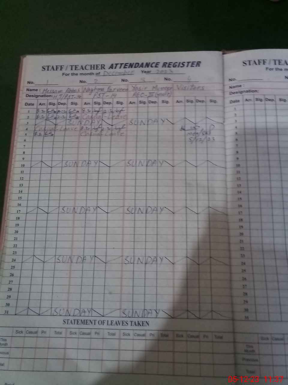 | CNIC | Full Name | Designation | R/C | Absence During Last Calender Month |