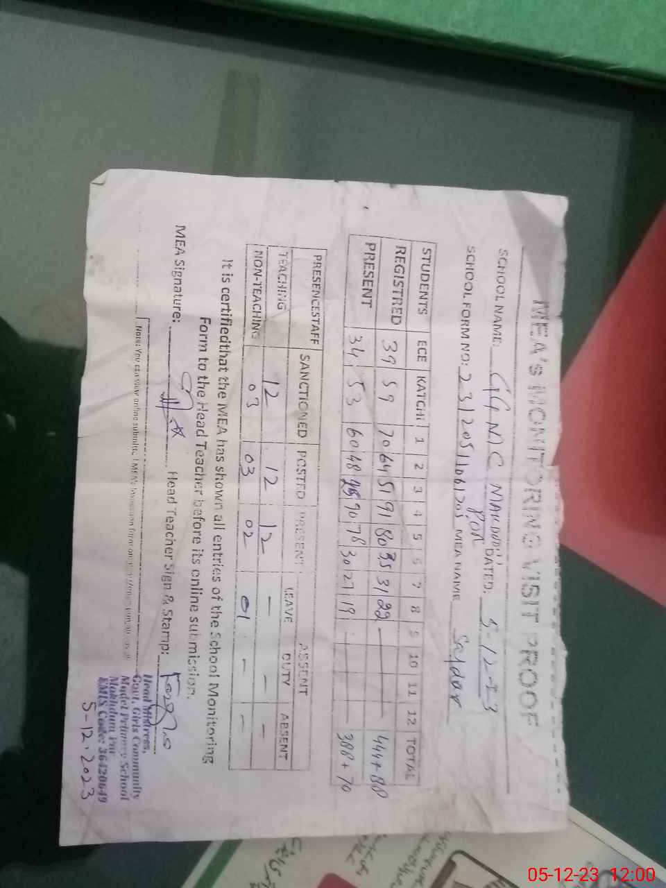 | Attendance Register | Head Teacher | MEA with School | Visit Proof |