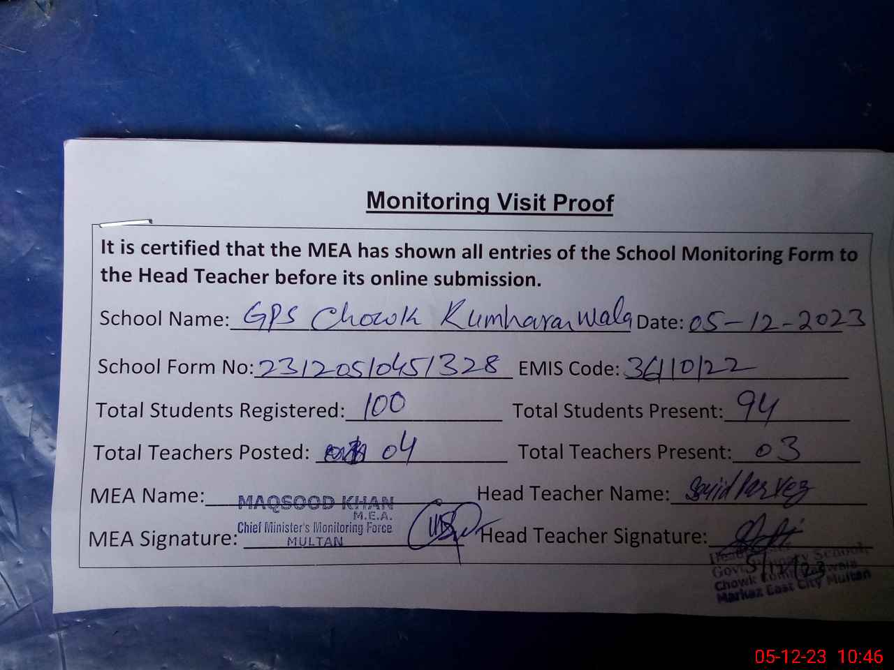 | EMIS Code: 36110122 | Name of School: GPS CHOWK KUMHARAN WALA | |||