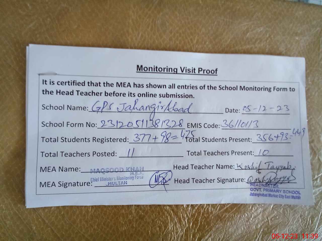 | Attendance Register | Head Teacher | MEA with School | Visit Proof |
