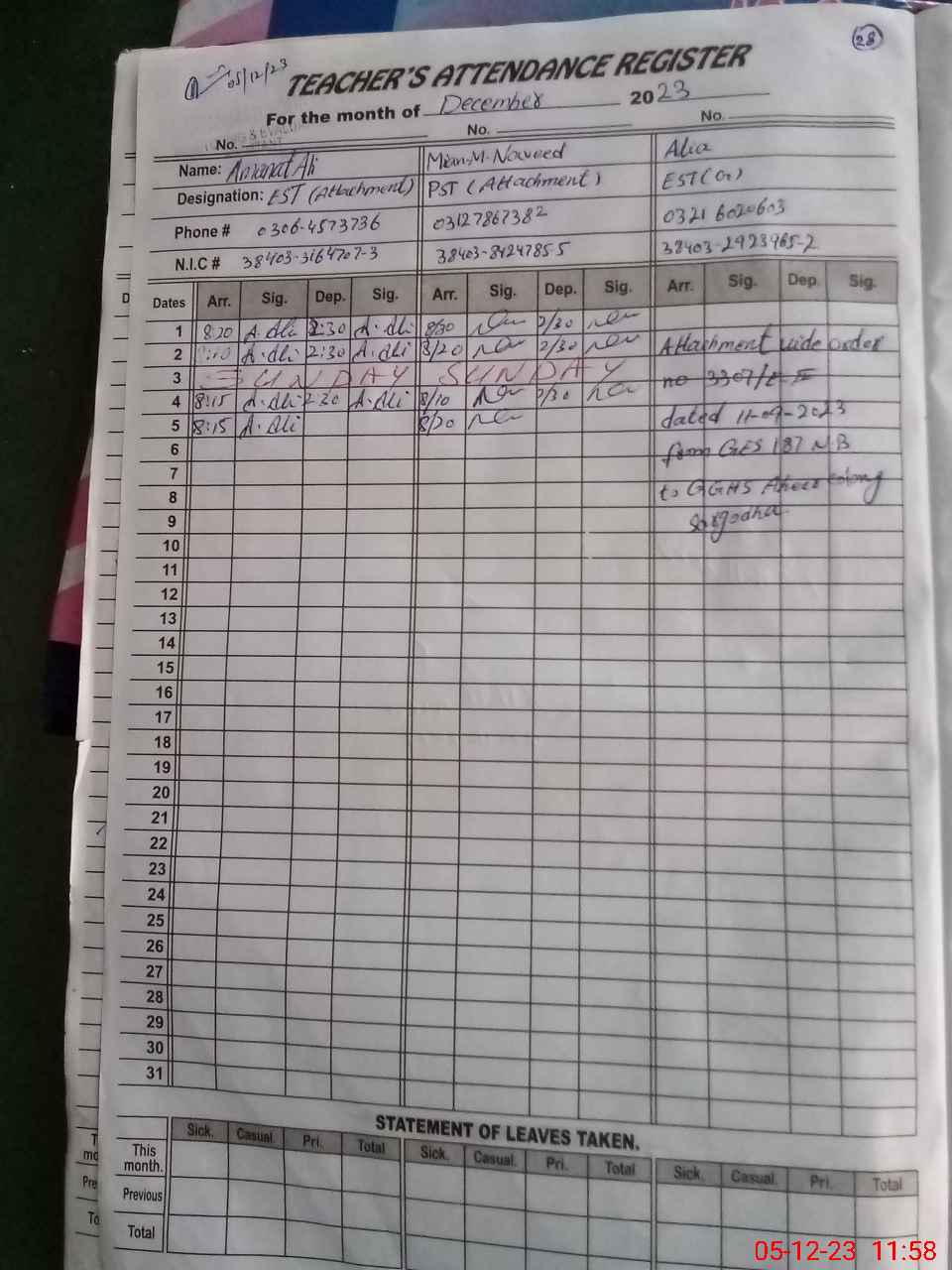 | CNIC | Full Name | Designation | R/C | Absence During Last Calender Month |