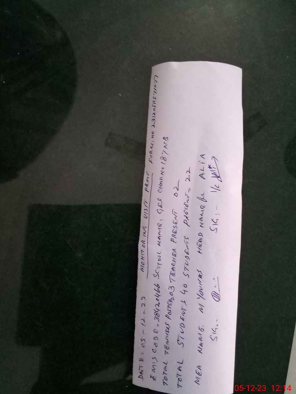 | Monitoring Date: 05-12-2023 | Start Time: 05-12-2023 11:56 AM | End Time: 05-12-2023 12:21 PM | Name of MEA: MU**** YO**** | |