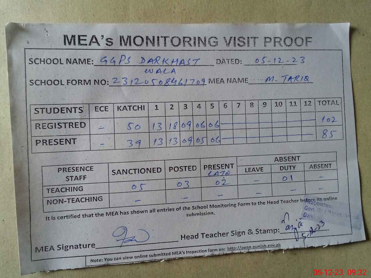 | Attendance Register | Head Teacher | MEA with School | Visit Proof |