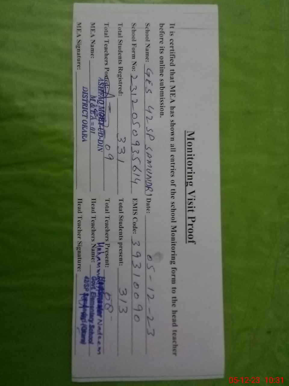 | EMIS Code: 39310090 | Name of School: GES CHAK 42/SP SAMUNDARI | |||