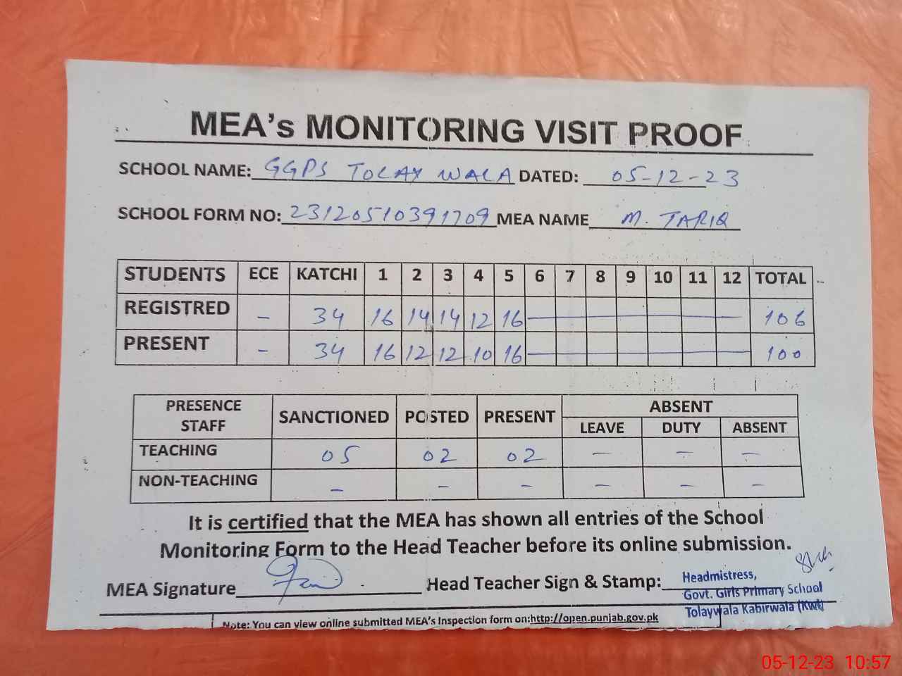 | EMIS Code: 36410341 | Name of School: GGPS TOLAY WALA, P/O KOHI WALA, KABIRWALA | |||