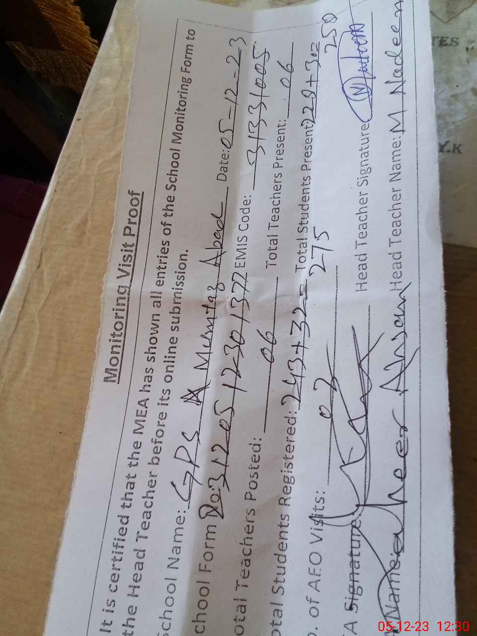 | EMIS Code: 31331005 | Name of School: GPS MUMTAZ ABAD | |||