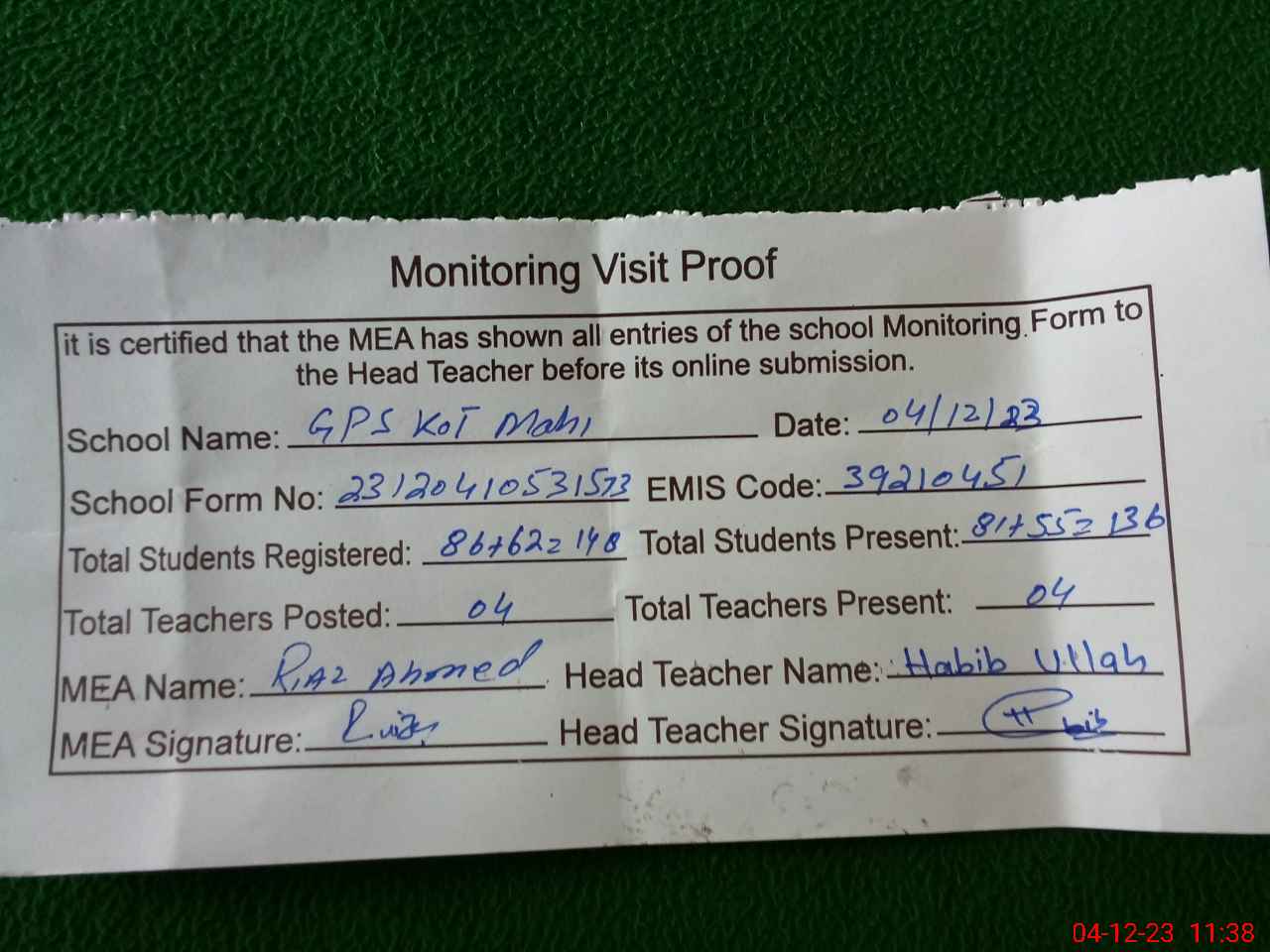| EMIS Code: 39210451 | Name of School: GPS KOT MAHI P/O DHUPA | |||