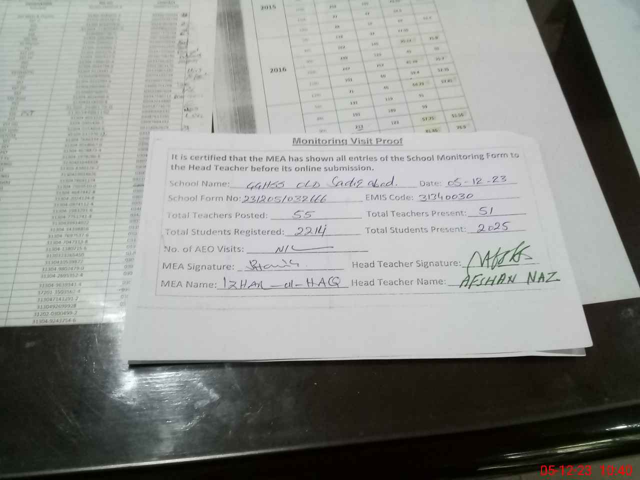 | Monitoring Date: 05-12-2023 | Start Time: 05-12-2023 09:48 AM | End Time: 05-12-2023 10:43 AM | Name of MEA: Mu**** Iz**** UlHa**** | |