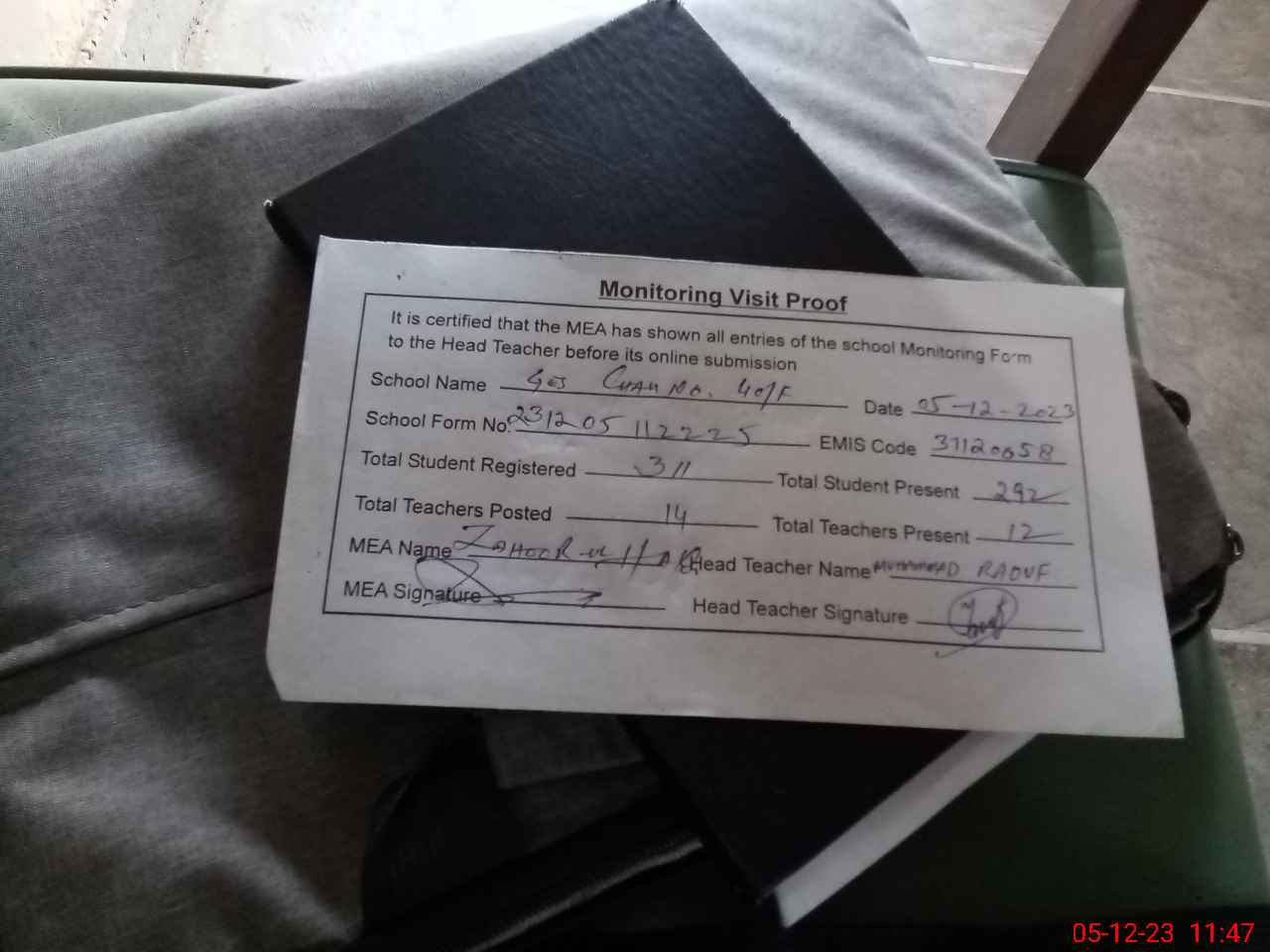 | Attendance Register | Head Teacher | MEA with School | Visit Proof |