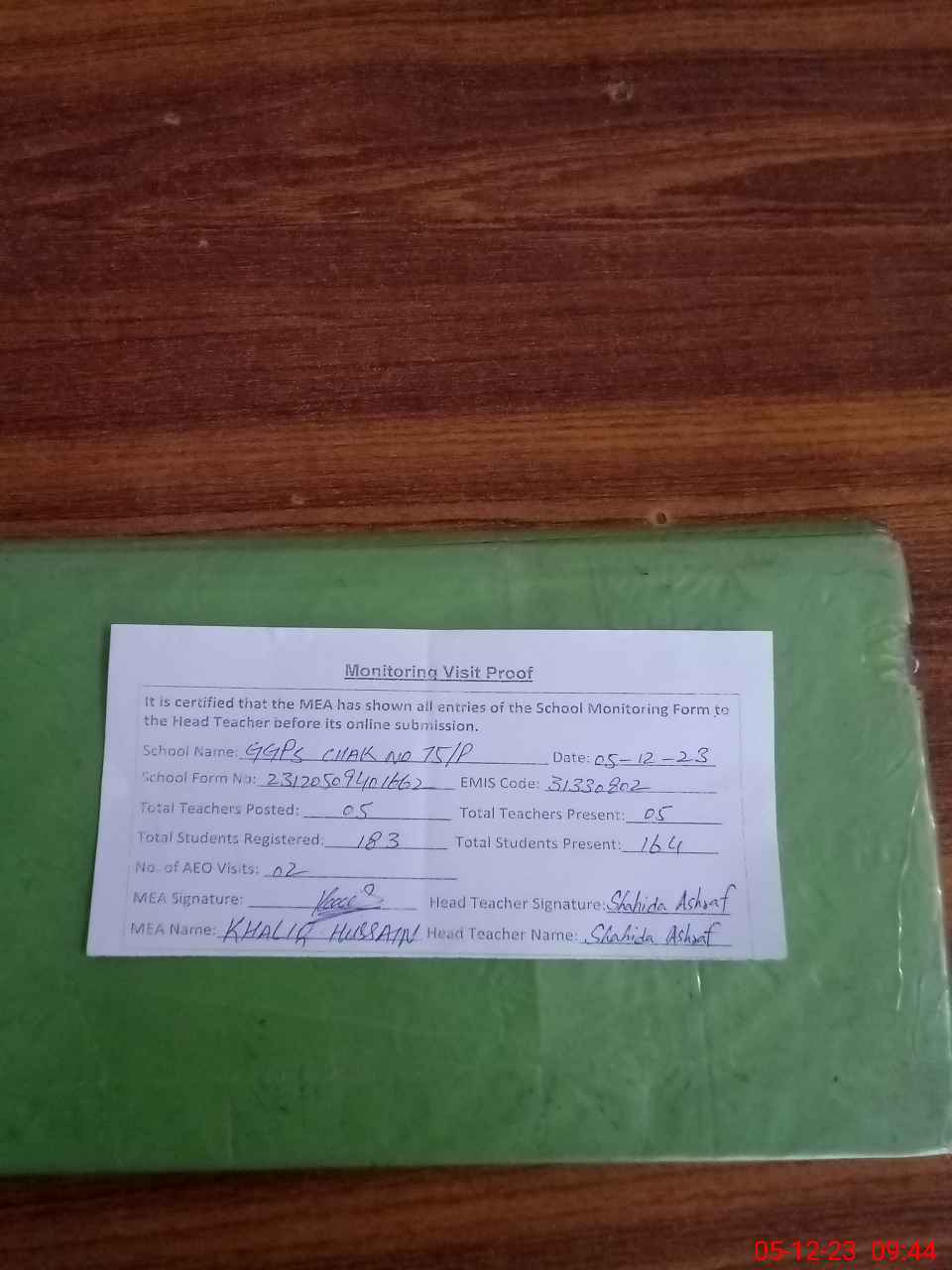 | Attendance Register | Head Teacher | MEA with School | Visit Proof |