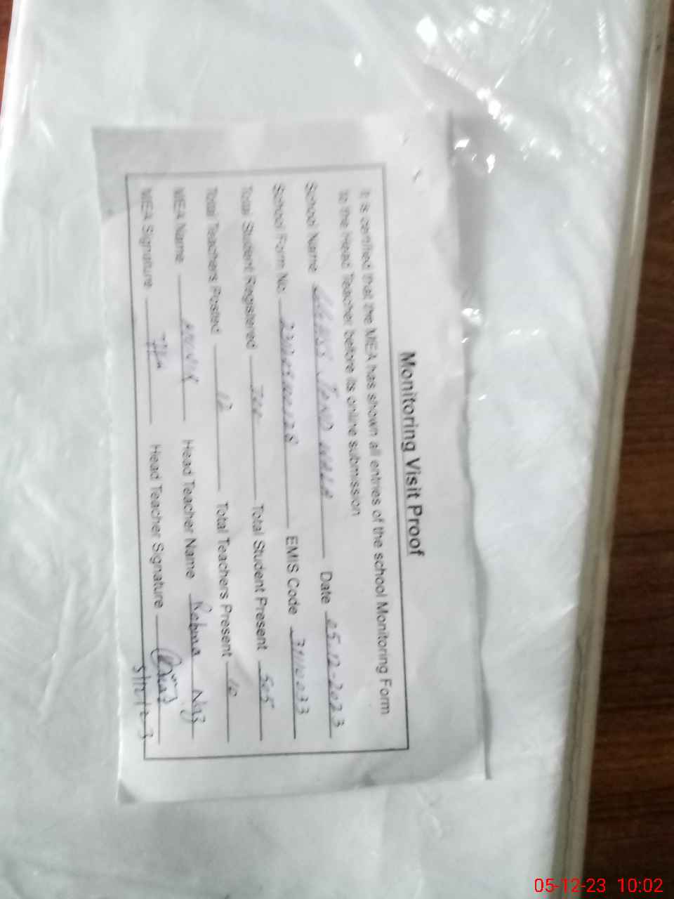| Attendance Register | Head Teacher | MEA with School | Visit Proof |