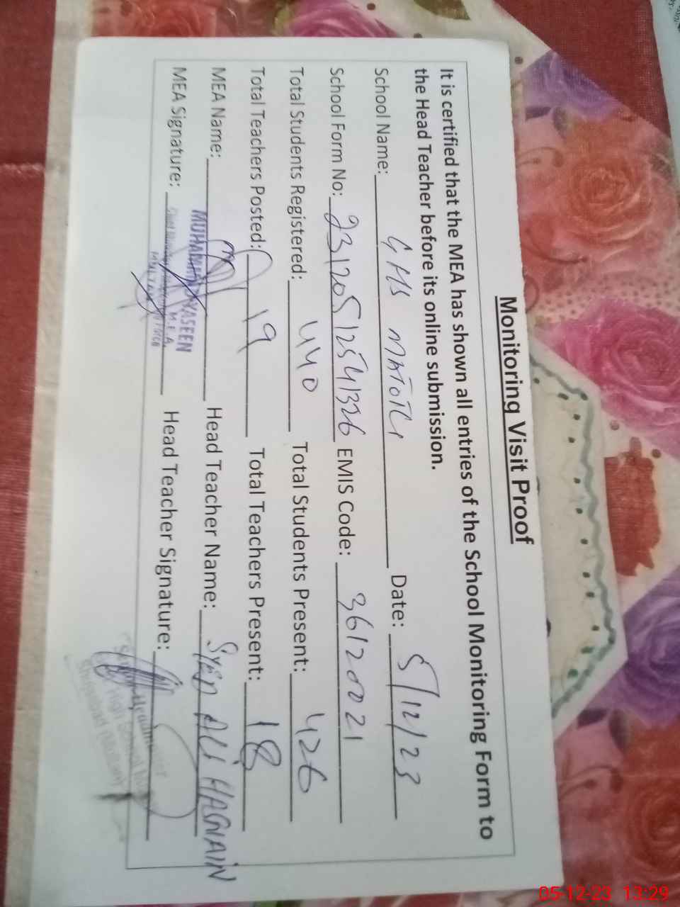 | Attendance Register | Head Teacher | MEA with School | Visit Proof |