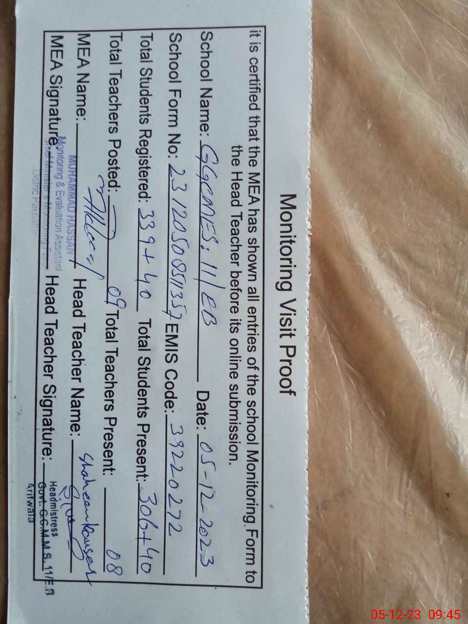 | Attendance Register | Head Teacher | MEA with School | Visit Proof |