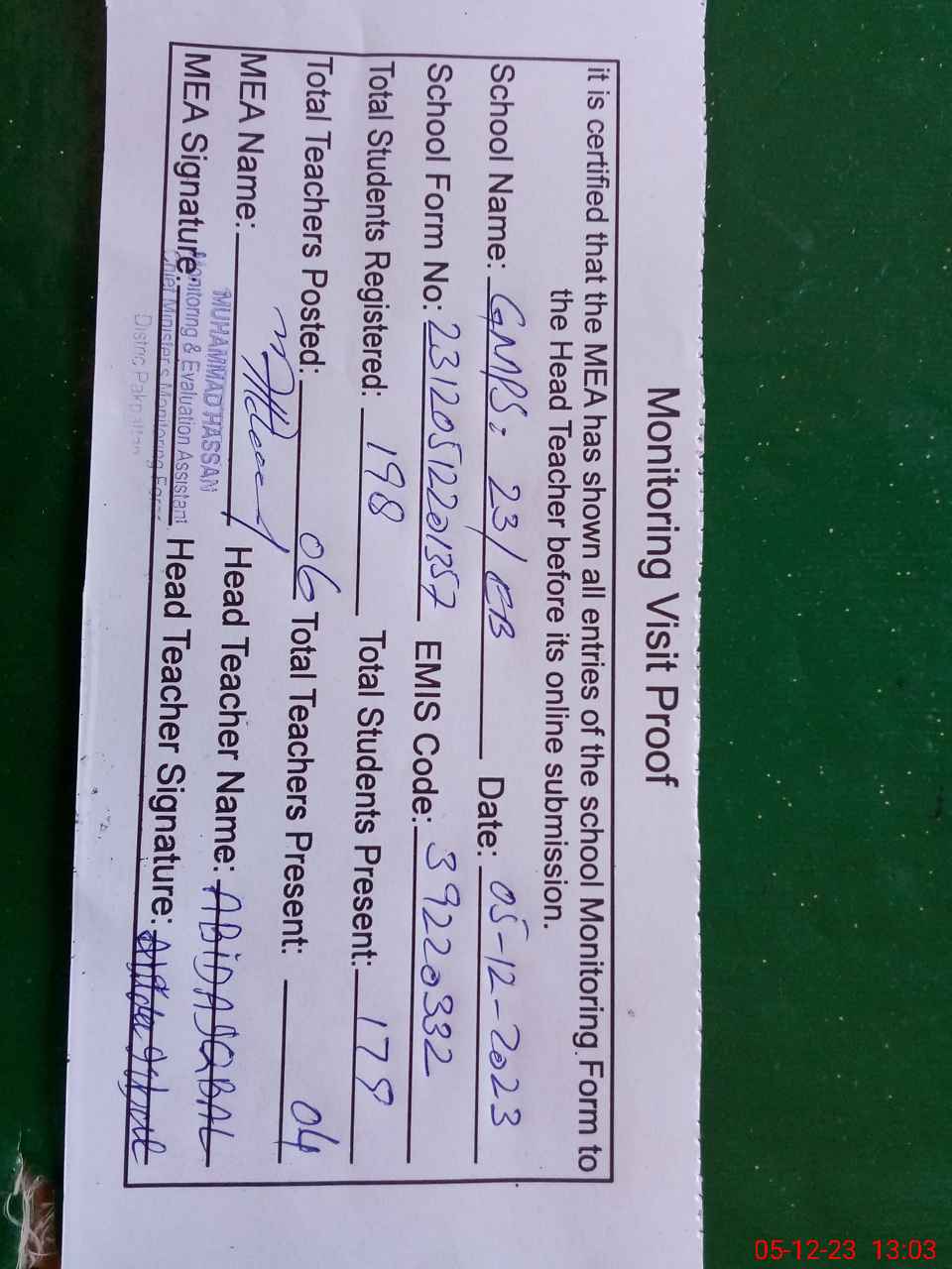 | EMIS Code: 39220332 | Name of School: GMPS CHAK NO. 23 EB | |||