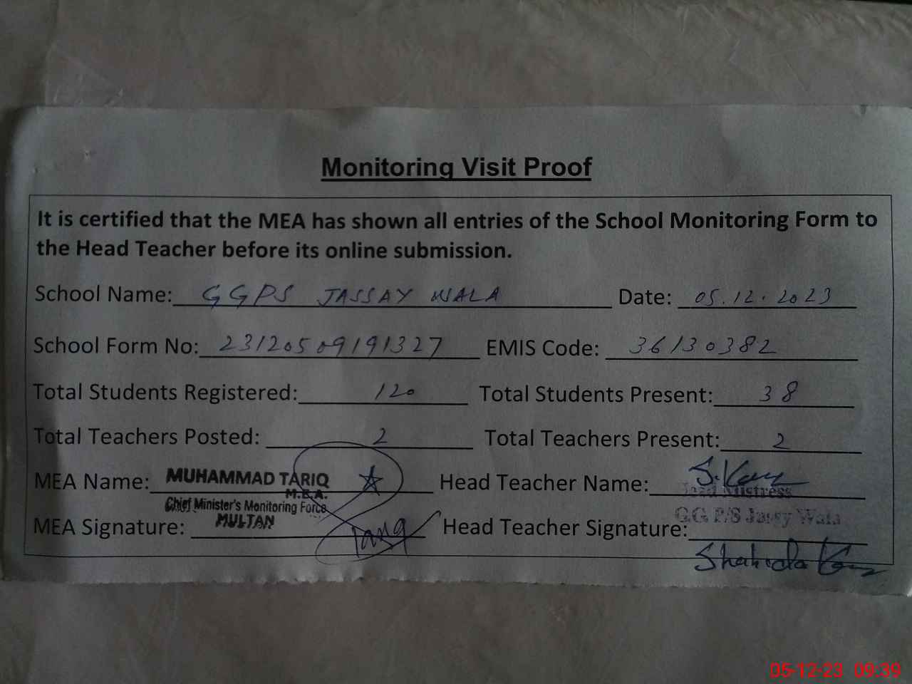 | Attendance Register | Head Teacher | MEA with School | Visit Proof |