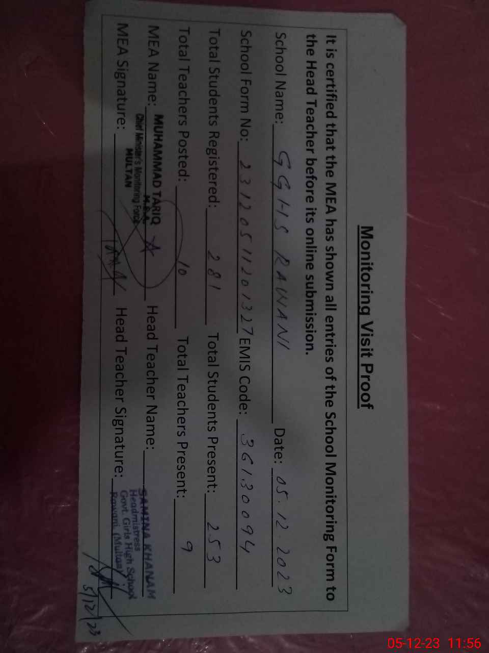 | EMIS Code: 36130094 | Name of School: GGHS RAWANI MULTAN | |||