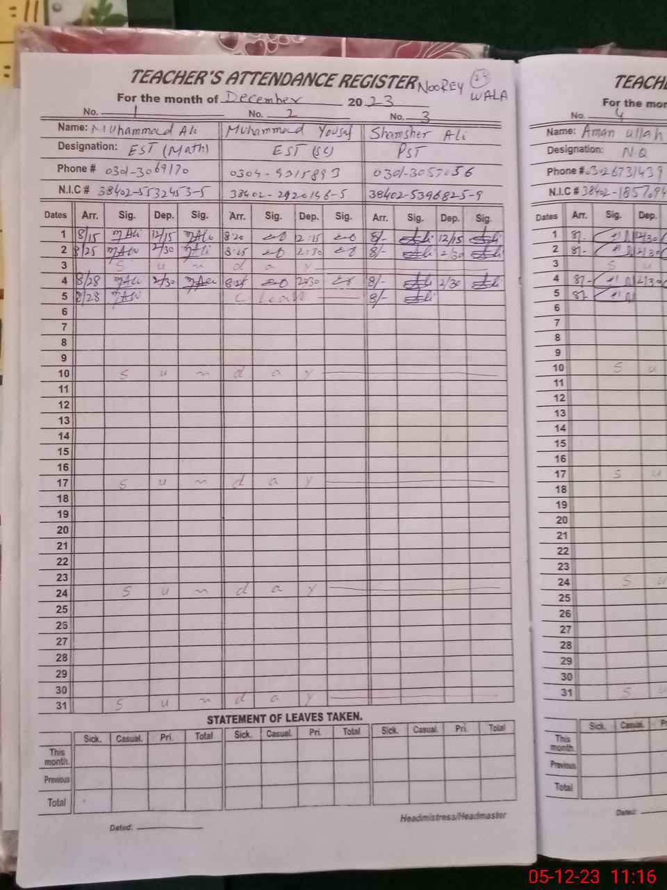 | Name: MU**** AL**** Designation: (School Headmaster's/Headmistress's) EST (GENRAL) Phone/Cell Number: 03**** |